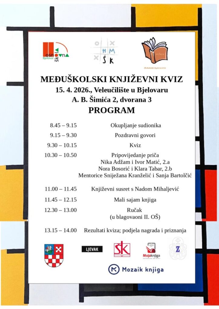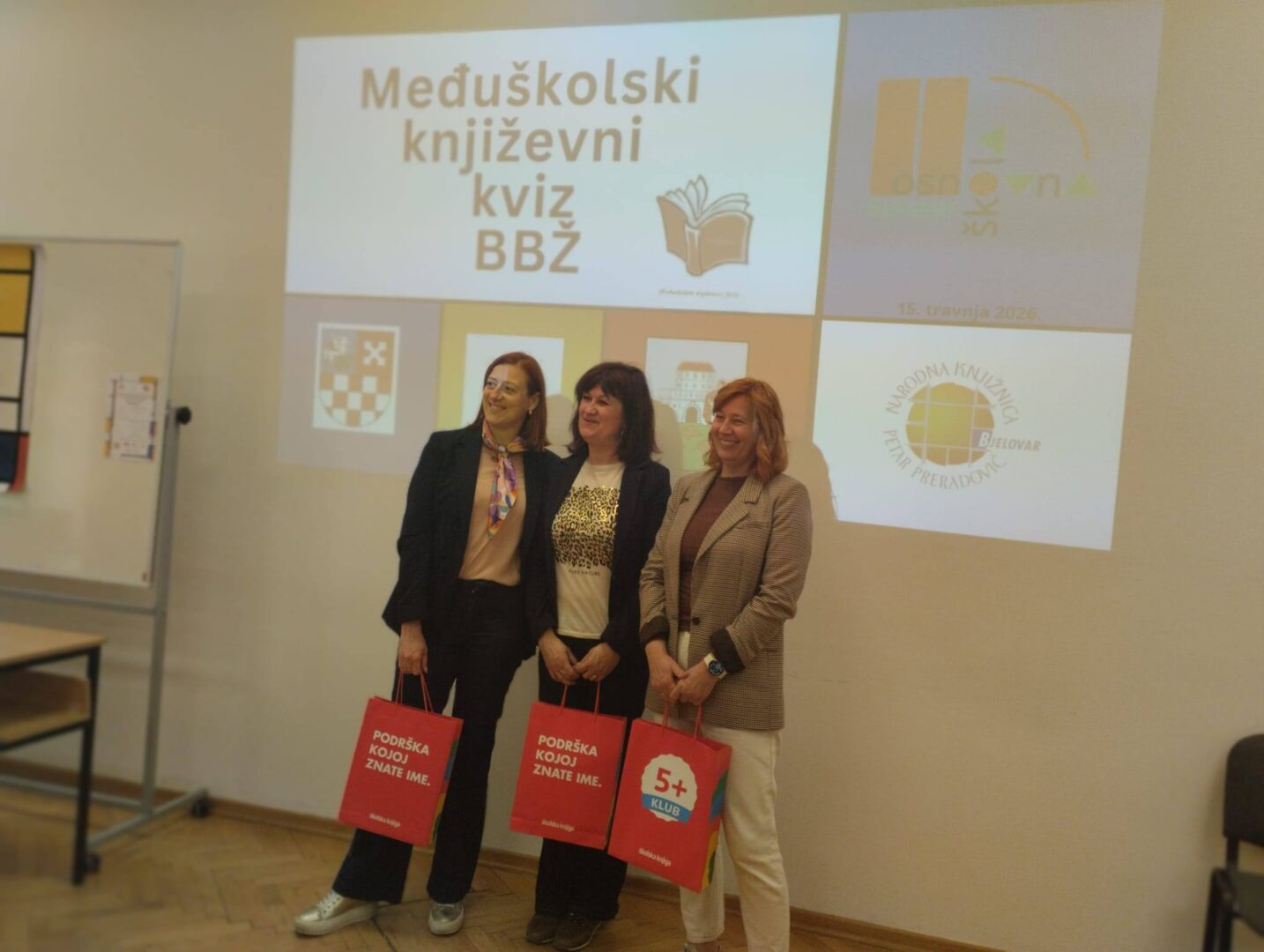 U srijedu 15. travnja 2026. održan je 15. Međuškolski književni kviz koji je i ove godine okupio brojne ljubitelje čitanja i dobre knjige. Kao domaćini, s ponosom smo ugostili učenike i mentore iz drugih škola te zajedno proveli dan ispunjen znanjem, druženjem i književnošću. Zahvaljujemo Veleučilištu u Bjelovaru što nam je omogućilo korištenje prostora za naše druženje.