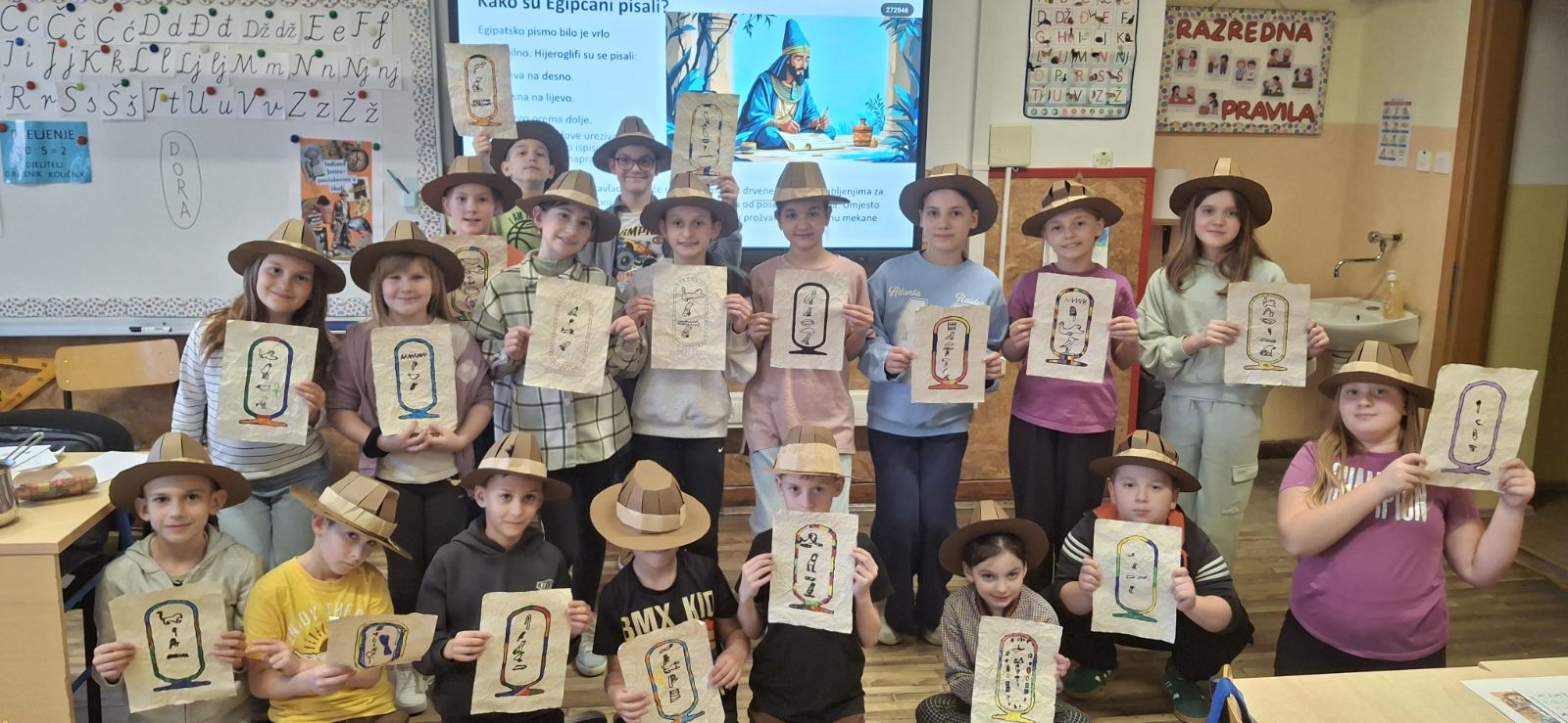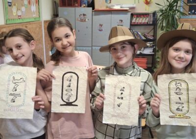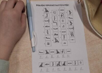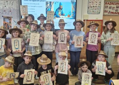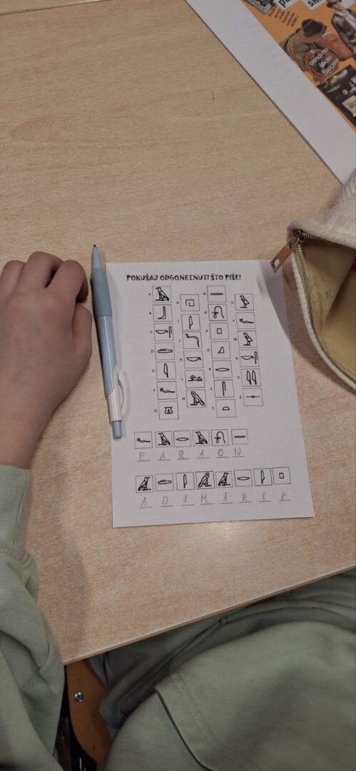 Kroz interaktivno predavanje i praktičan rad, učenici su istražili tajanstveni svijet hijeroglifa –  pismo koje je stoljećima skrivalo tajne faraona. Naučili su kako su stari Egipćani koristili simbole za zapisivanje važnih događaja te su se i sami okušali u drevnim vještinama.